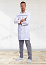 Халат мужской прямого силуэта средней длины с центральной бортовой застежкой на кнопки. Полочки с отрезными кокетками, декорированными отделочным материалом, вместительными накладными карманами в нижней части и нагрудным карманом с отделкой из контрастного материала на левой полочке. Спинка с отрезной кокеткой и средним швом. Объем по линии талии регулируется полупоясами с фиксацией на кнопки. Воротник классический. Рукав втачной длинный. В боковых швах халата предусмотрены разрезы, обеспечивающие свободу движений. Халат прост в уходе, практичен и удобен, предназначен для медицинских работников.