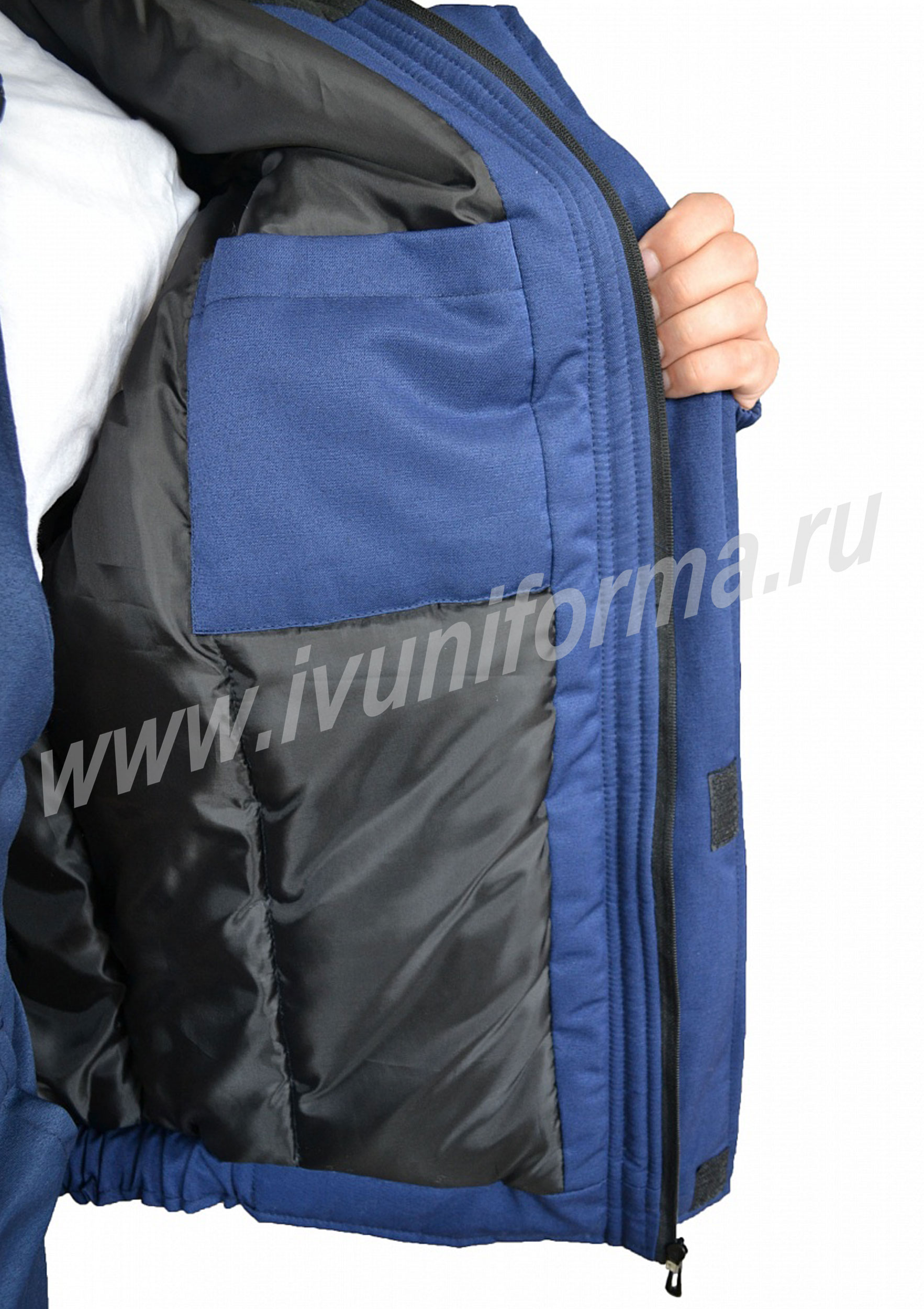 Куртка рабочая укороченная на поясе с центральной боровой застежкой на тесьму молнию, закрытую планкой на текстильной ленте велькро. Полочка состоит из двух частей, по линии стачивания которых настрочена светоотражающая лента шириной 50мм. На куртке два нагрудных накладных кармана с фигурным клапаном на текстильной ленте велькро. Два накладных боковых кармана с фигурным клапаном с соответствующей застежкой. Боковой карман имеет дополнительный карман. Наличие кармана внутри. Спинка состоит из двух частей, по линии стачивания которых настрочена светоотражающая лента шириной 50мм. На основной части спинки две складки. Рукав втачной одношовный. Низ рукава оформлен резинкой, внутри трикотажный манжет. Капюшон утепленный объемный с хомутом, пристегивается на молнию.